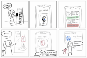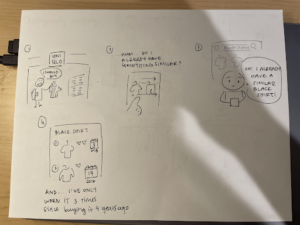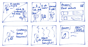 The storyboards illustrate scenarios where each intervention plays a pivotal role in altering the personas’ purchasing behaviors. For the Venmo idea, the storyboard shows how social feedback leads to reconsideration of impulsive buys. The Item’s Value Log storyboard depicts a moment of insight where a user rethinks a purchase based on past usage data. Lastly, Purchasing Things for Others showcases the satisfaction derived from altruistic spending, aligning personal values with actions. The Mindful Shopping Cards storyboard (our finalized idea) captures the journey of self-reflection encouraged by thoughtful prompts, leading to more deliberate and measured shopping choices, effectively integrating a critical pause into the often impulsive online shopping process.