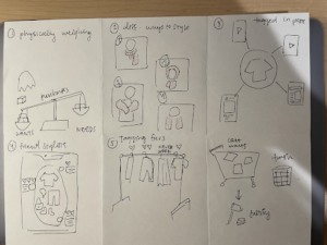 The sketches depicted preliminary ideas around social feedback mechanisms, value tracking of purchased items, and facilitating purchases for others as a form of mindful spending.