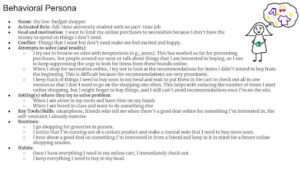 The Low-Budget Shopper is a university student without a stable source of income – the conflict is that nonessential purchases bring them more joy than necessities. Due to the income constraint, this is a persona grounded by the Foggs Behavior Model – behavior being a product of motivation, ability, and trigger. Here, the lack of a stable income represents the lowered ability to purchase nonessential items. However, there is higher motivation to purchase nonessentials as they bring more joy to the Low-Budget Shopper. The misalignment between their goal to only purchase essentials and the conflict of tempting nonessentials make for an interesting imbalance between motivation and ability. The Low-Budget Shopper is different from the “I’m just a girl” persona described below primarily because this one focuses on financial ability while the other is centered around social norms.