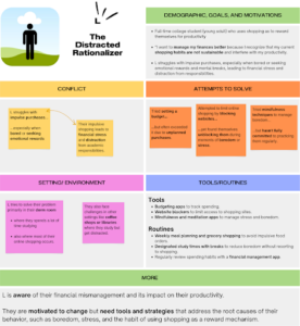 The “I’m just a girl” persona is centered on the need to appear fashionable and trendy even in the midst of trends constantly changing. This search for belonging through stylish outfits is driven by the Social Norms Theory – what is considered acceptable by the majority of their social groups primarily influences their own behavior, goals, and motivations. The “I’m just a girl” persona prioritizes their need to appear to fit in above all else – and disregards budgeting and overconsumption risks. The trigger to their purchases is seeing new trends on social media, and our team is exploring how we can use the Social Norms Theory as fuel for changed behavior. Rather than trying to stop “I’m just a girl” personas from staying trendy, we’d like to use this as encouragement to continue doing so – we wouldn’t want to take away their joys. However, we’d explore ways to add friction to the transition from inspiration to purchasing an item in order to form habits of “stopping and thinking” before purchasing.