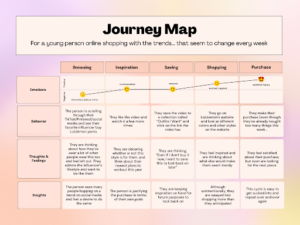 Our team also created a 2×2 synthesis to explore whether targeting motivation or ability would be the more fitting approach for each shopper action. For example, we see that asking for a second opinion may be hardest to start and also hard to do. If a trustworthy friend or family member of the shopper could be more active in the shopping experience, perhaps we could offload some of that ability and motivation off of the shopper? If we decide to go forward with this, we must also consider the downside of adding weight of responsibility onto the trustworthy friend or family member. Another point of interest is that taking mental breaks is easy to do and not too hard to start. When scrolling on our phones is considered a break, it is more likely that shoppers will resort to this as their first choice for a “mental break.” Rather than trying to stop them from scrolling, is it possible to use this need for screen time as a tool for developing better shopping habits?