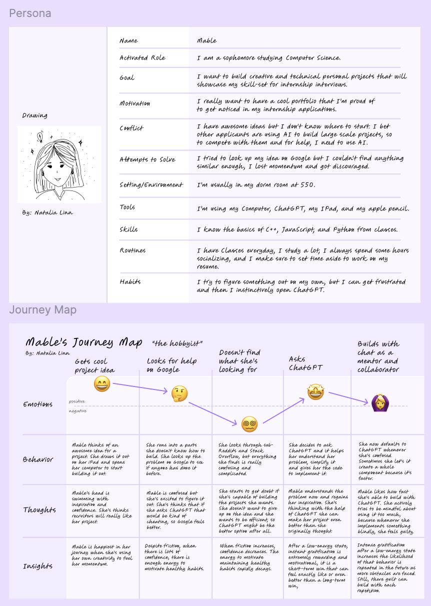Mable represents the type of student who uses AI to help build personal projects. She’s motivated by wanting to build out her big ideas and put them on her resume for job recruitment, but she doesn’t always know where to start. She likes using AI as a mentor to help her through roadblocks. It’s helpful to her when it creates step-by-step instructions on how to build a certain part. However, whenever she uses AI directly in her project, she feels guilty, especially if she doesn’t understand the implementation and she just decides to move on in the interest of time.