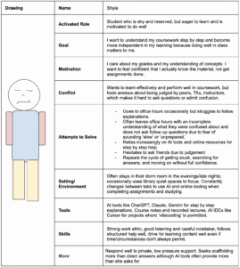 The above behavioral persona ‘Shyla’ represents a shy but highly motivated student who cares a lot about her academic performance. She wants to understand concepts in a step by step manner and build independence in problem solving, not just complete assignments for the sake of submission. However, fear of judgement from peers, TAs, and instructors makes it difficult for her to ask clarifying questions or admit confusion. As a result, she finds herself turning to AI tools and online resources that are low pressure channels to get help before reaching out to people. She has a strong work ethic and follows structured guidance well, but often leaves office hours without full clarity, often from fear of asking too many clarification questions. She benefits most from having private, supportive scaffolding help that reduces social pressure while still guiding her to develop an understanding of concepts.