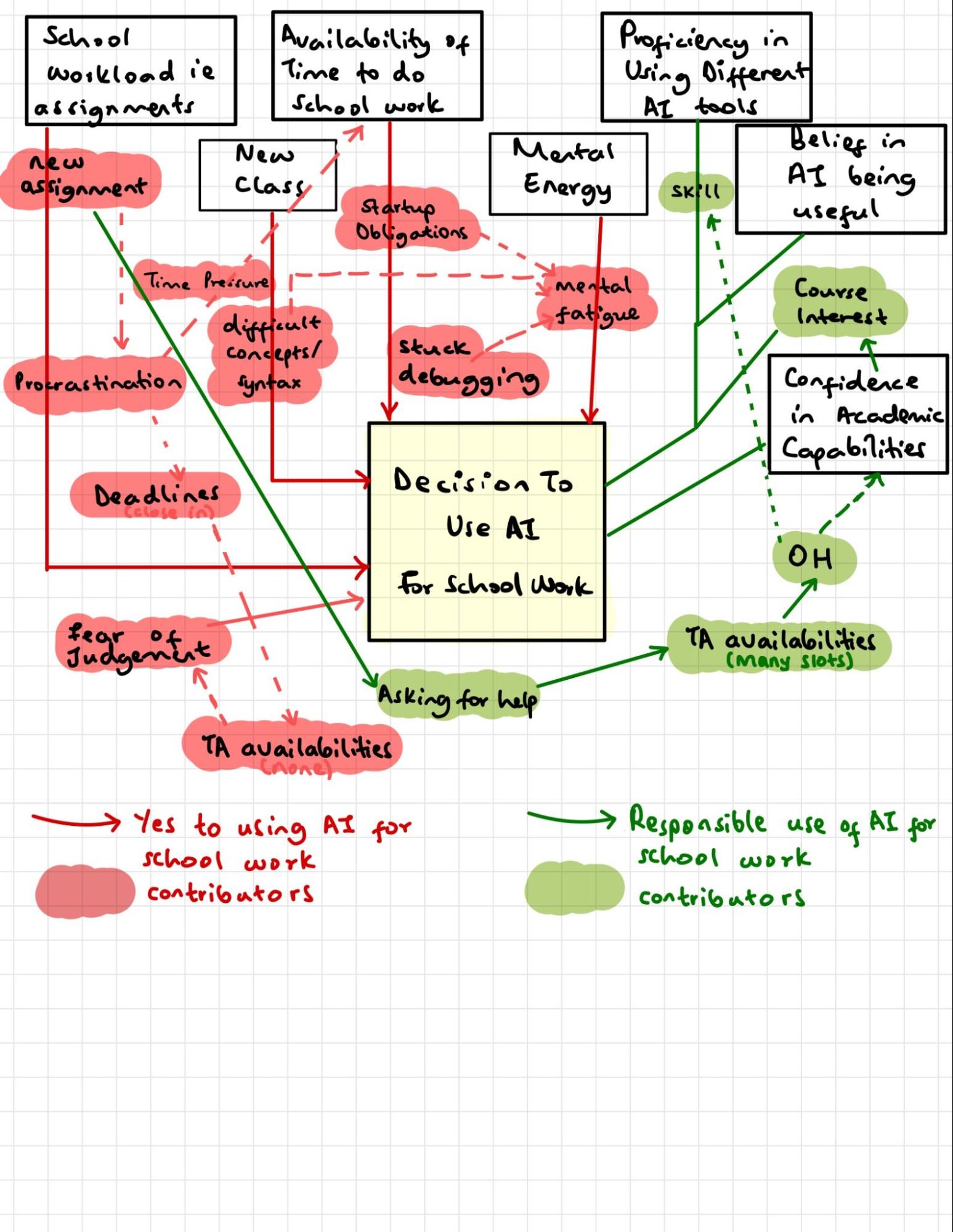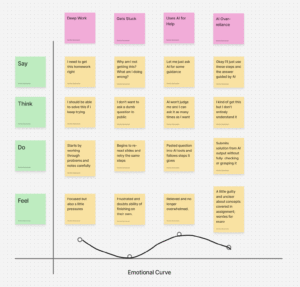 From the affinity clusters, we observed that AI use is most often triggered by pressure, time constraints, and lack of mental energy rather than laziness or lack of effort alone. Students repeatedly described turning to AI when deadlines were stacked, when they felt “burnt out,” or when they were switching between school and other commitments such as startup work, TA duties, or side projects. AI was framed less as a novelty tool and more as a pressure response or stress mitigation tool. A strong pattern that emerged was a split mental model of AI as both a tutor and a shortcut. Many participants described AI as a learning support system that helps explain concepts and unblock confusion, yet in practice they often ended up using the tool as a shortcut when efficiency became the priority. This created a recurring tension between scaffolding forward use and efficiency maximizing use, indicating a key discrepancy between intended use and actual use.