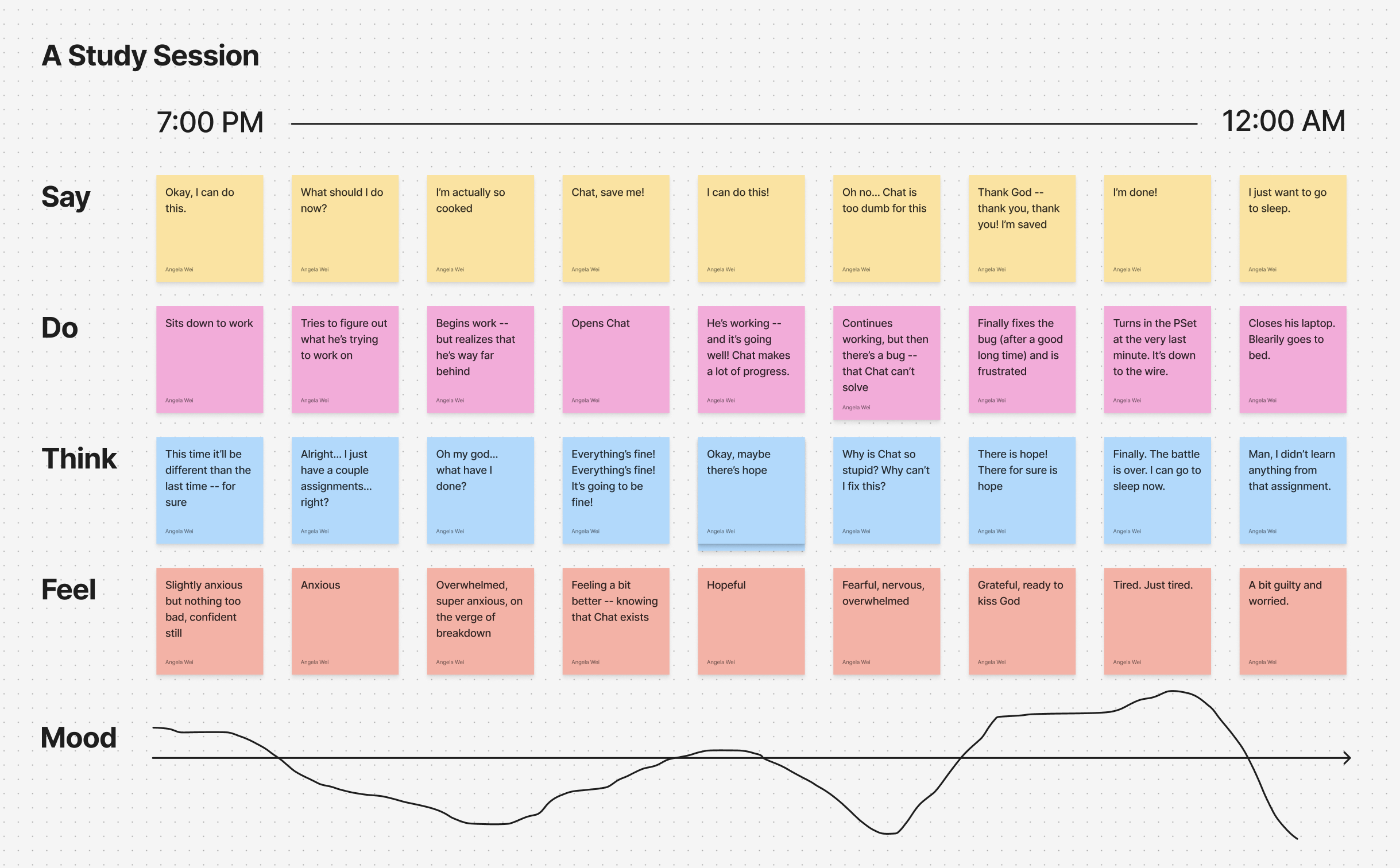 This journey map documents a study session: an optimistically too-late study session.