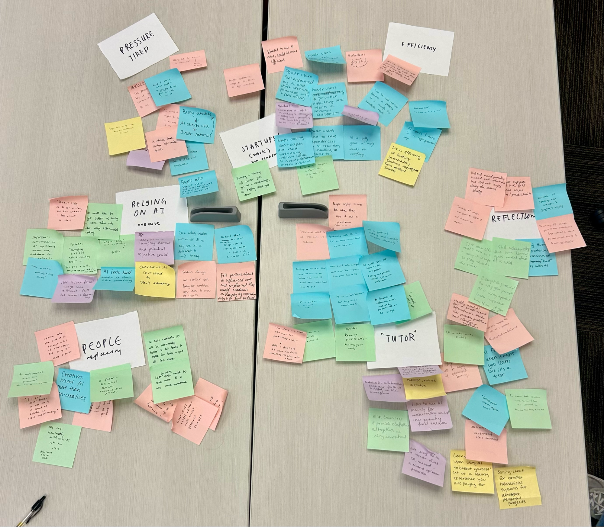Upon synthesis, we noticed a large number of notes and conducted an affinity mapping exercise to cluster related observations. We grouped notes based on shared patterns in motivation, intentions behind AI use, decision triggers, emotional responses and AI use behaviors. Our clusters focus especially on moments where students’ described intentions did not match their actual behavior, as well as repeated triggers that led them to rely on AI.