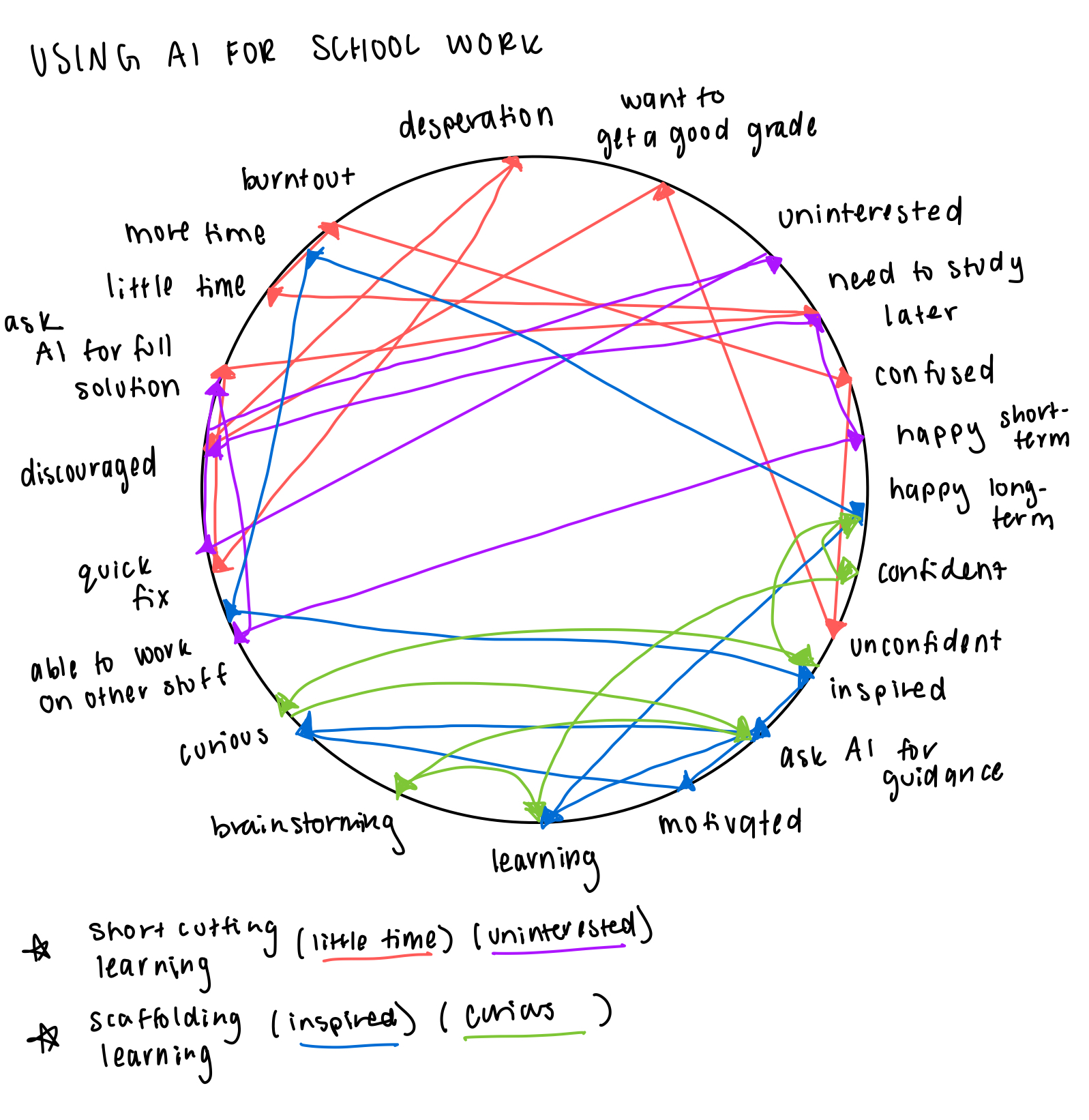 Within shortcutting learning, there are two loops: “little time” and “uninterested.” “Little time” represents the student that perceives the value of efficient completion of an assignment as higher than the value of learning it deeply in that moment. In this loop, the student is busy and burnt out which leads them to struggle to finish the assignment, they lose confidence in their ability to do it on their own and get a good grade so they ask AI for the complete answer and copy it. This results in them needing to study those concepts later which steals away time from their future self, who is even more pressed for time and resorts to AI again. “Uninterested” represents the user that doesn’t want to learn the content of the assignment, so they use AI to solve their problems so they can work on something they are more inclined to do. They find themselves in a loop where they start apathetic, learn nothing from copying off of AI, become even less interested and more discouraged, they need to study more in the future with no motivation, so they rely on AI even more and become increasingly uninterested. As for the scaffolding learning group, we have “inspired” and “curious.” “Inspired” is a student who loves the content of their assignment and really wants to internalize it. Their inspiration motivates them to be curious and ask AI for guiding questions to their problems, this causes them to learn, making them happier long-term and affording their future self more time to work on other passions which in turn inspired them to learn. “Curious” is a student who uses AI to explore their ideas, when they brainstorm with AI through guiding questions, they learn and become more confident in their imagination and projects, this supports their project building and inspires them to be curious more often. This model shows how different behaviors with AI can enforce different learning instincts and results in students long-term given how the habit proves itself.