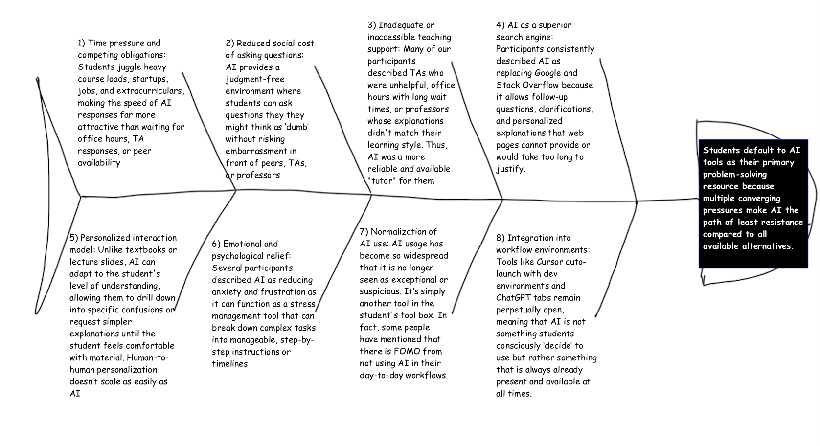 This fishbone model shows the high-level forces that lead students (over)rely on AI as the default resource rather than as a supplement. Our interviews and diary data repeatedly surfaced a pattern: students did not start using AI on the presumption that they’d rely on it heavily, but rather a mix of different pressures, like time scarcity, social anxiety around asking questions, inconsistent quality of human support, and the sheer convenience of an always-on helper. One participant described his startup work as “near-impossible without Cursor,” while another noted that before AI, solving bugs “could take days” and involve office hours and tutoring sessions. The friction of accessing human help versus the completely frictionless process of accessing AI help creates a powerful attraction.