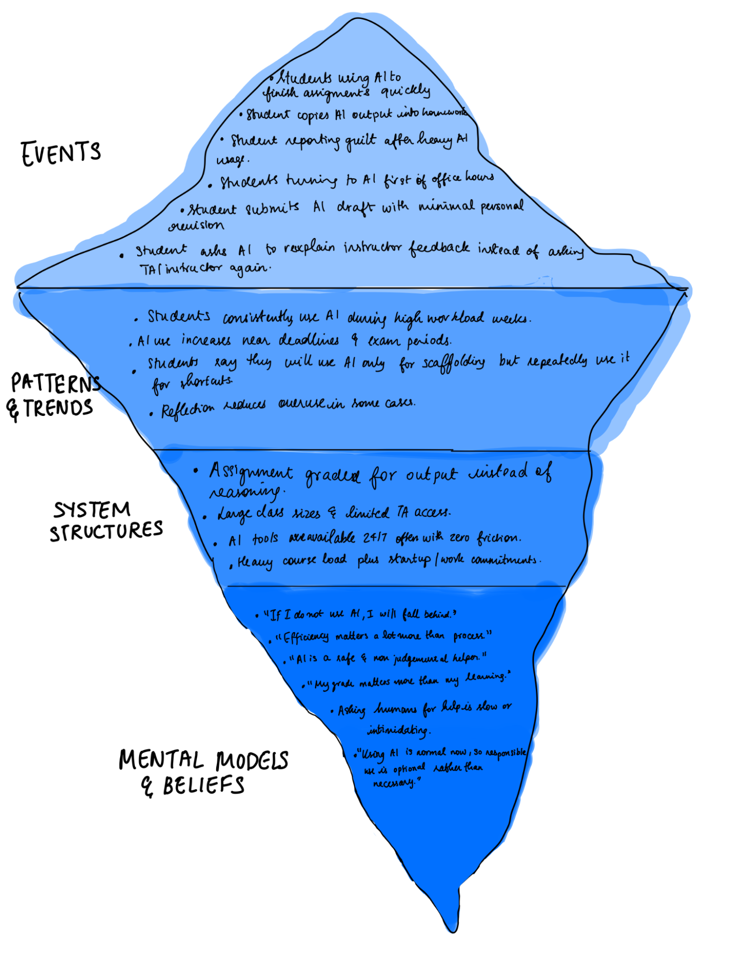 At deeper levels, the model highlights the system structures and mental models that propagate these patterns. Structural factors include assignments graded mainly for output instead of reasoning, large class sizes with limited TA access, restriction-free AI tool availability, and heavy course loads combined with outside commitments. These conditions make AI the lowest cost help channel compared to human support. At the deepest level, student beliefs further reinforce the behavior, including fears of falling behind without AI, prioritizing efficiency over process, viewing AI as a safe alternative to human help. There is also a growing sense that since AI use is normalized, responsible use is optional rather than necessary. Taken together, the iceberg model shows that AI overreliance is not just an individual behavior issue but a system level effect shaped by pressure patterns and beliefs that are shaped over time.