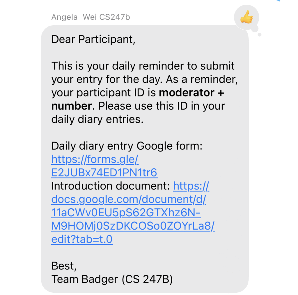 We had twelve participants take part in our eight-day baseline study that ran from 1/20/2026 to 1/28/2026. They participated in a baseline interview, a diary study, and a post-study interview. To maintain a diary, our participants logged in their AI usage habits on a Google Form (template) on a daily basis, and we tracked their responses on a Google Sheet. They received reminders to fill in the form at the end of each day around 9pm via text message as shown below: