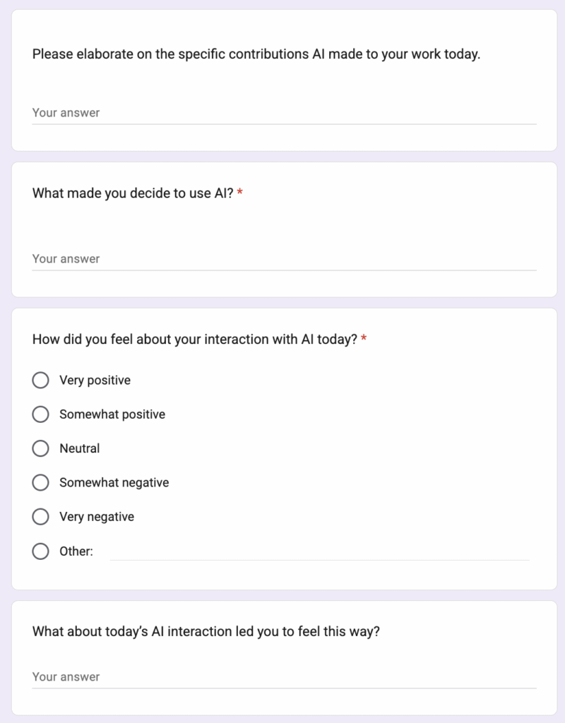 Our diary had a mix of open-ended questions and multiple choice questions. This is because we wanted to ensure that the form felt easy to fill out, while allowing participants some more flexibility and freedom for qualitative insights. For example, how long they used AI for was a multiple-choice question, while follow-up questions about participants’ feelings were open-ended. For some, we used multi-select multiple choice answers so that participants would not feel restricted to one answer only: for example, “For what academic tasks did you use AI today? (Select all that apply)”.