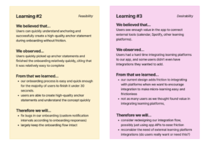 We learned that users enjoyed our onboarding process, with an average completion time of 32 seconds, full completion of the process, an average understanding of 4.33/5 for anchor statements, and an average ease rating of 3.66/5. Due to a bug, some participants were confused why the notification setting couldn’t be customized according to their learning frequency preferences, which we realized we needed to fix after the tests were conducted. However, the assumption tests validated our assumption that users can quickly understand anchoring and set up notifications, goals, and an anchor statement through our onboarding process, and we feel fairly confident that the majority of users will find this process frictionless, and will be able to quickly get started on micro-learning!