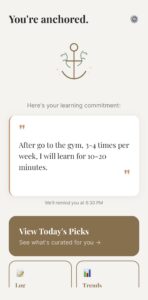 For our first experiment, we focused on the assumption that users can quickly understand anchoring and successfully create a high-quality anchor statement during onboarding without friction. To run this, we created an onboarding flow prototype. In the onboarding flow, users first note how often they want to microlearn, then how long they want each session to be, identify an anchor, identify a learning topic, set up notifications, and then review their anchor statement.