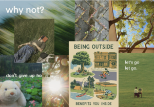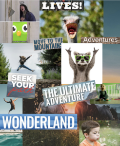 We combined the best from each mood board while determining a cohesive theme. Specifically, the blurred motion in the top left represents active motion and excitement that our app hopes to spur. It also signals a sense of spontaneity that we aim to foster. The top right represents a traditional nature scene and granola, representative of bridging between spontaneous activity and traditional hiking adventures. The words, LIVES, WONDERLAND, why not? emphasize exploration and adventure. The ostrich is funny and upbeat, balancing between the more formal hiking photo in the bottom left. The text at the bottom represents the push toward creating your own path through our app, seeking new adventures that define the student’s identity. Finally, the bottom right represents a child-like wonder we hope to foster.
