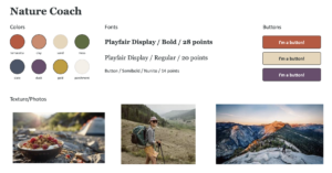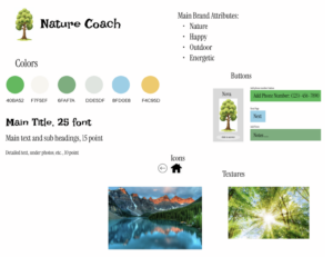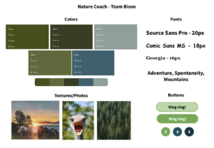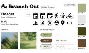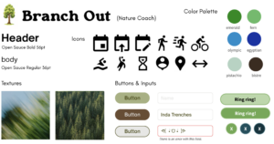 Our synthesized style tile draws upon elements of several different tiles from our team. The logo is a tree in light green, signaling an upbeat brand that still has structure and neatness. The name, Branch Out, is a pun and emphasizes our goal to have participants try new activities and meet new people. The fonts are structured, orderly, and trustworthy. Yet, the body font has sufficient deviation from formal fonts to signal lightheartedness in the application. The buttons range to represent tree and water colors. The icons are familiar and many signal motion. The color palette focuses on nature colors that will blend well with the theme of the application. Finally, the textures also align with the nature theme and encourage motion.