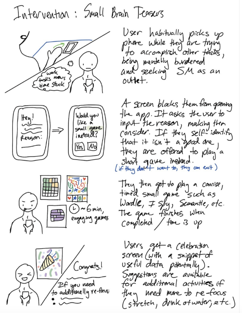 To replace the reflexive/unintentional use of social media, this idea aims to intervene by substituting the interaction on the phone with a small, short game. This is intended to shift user attention enough to get past wanting to use social media, and allow them to re-focus.