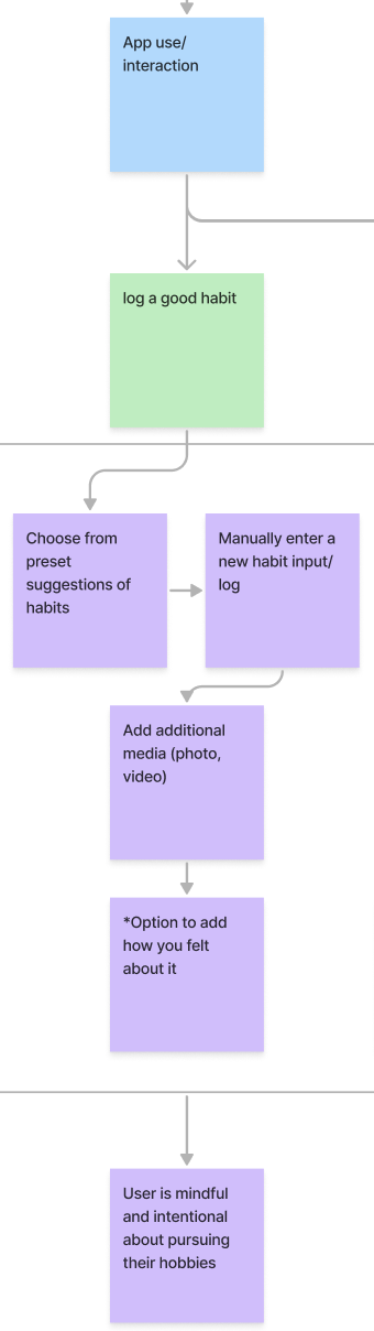 Considering other important use cases, we focused our onboarding process for Mary, whom we saw as an interested new user. Importantly, this helped shape our process for inputting new habit memories, which we divided into manual inputs and pre-filled suggestions. This was important in our design as we wanted to lower user friction when it came to adding more entries. Our goal is to make it easy for early users to use the app, and build continual engagement over time.