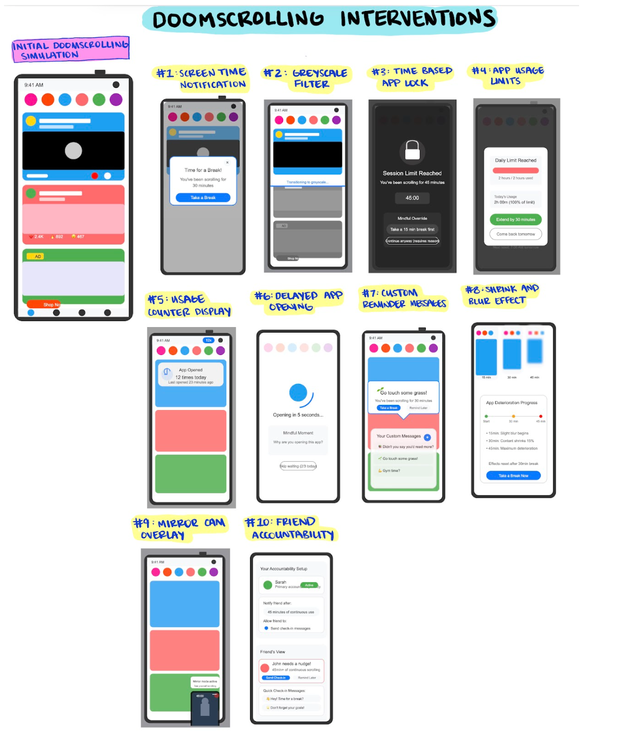 One by one, participants were shown visual representations of different interventions, each designed to disrupt excessive screen usage. After selecting their desired methods, participants described: