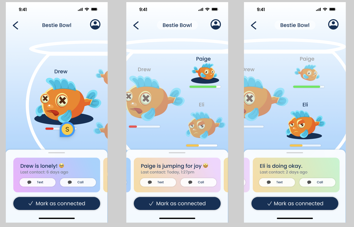 Introduction: Hook’d uses an ambient display to help users rekindle and maintain the meaningful relationships in their lives. Users can create a list of contacts they would like to contact more frequently, and use a cartoon fish to represent each contact. Each of these personalized cartoon fish thrive when users engage with that particular connection and deteriorate when communication wanes. By blending universal behavior cues, such as a cartoon fish in distress signaling the need for attention, with customizable design elements, Hook’d is able to balance personalization and emotional engagement. Through this usability test, we aim to understand if the interface is intuitive, efficient, and enjoyable.