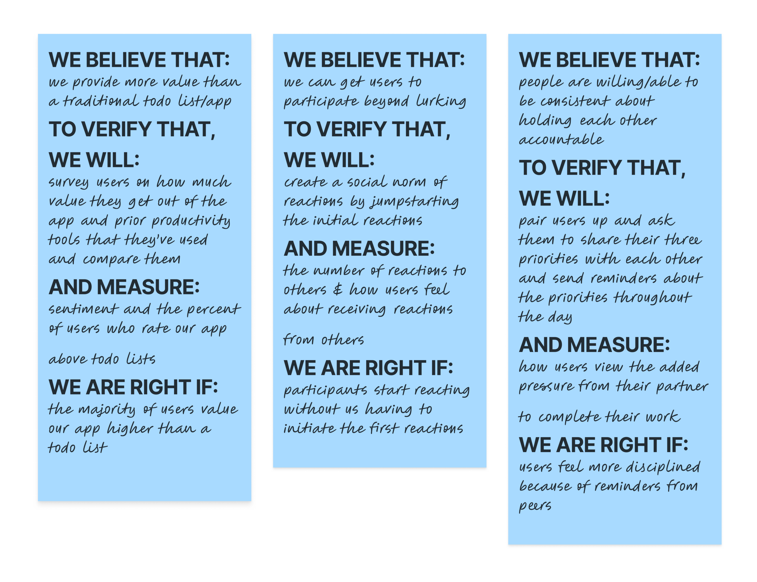 In creating our assumption map, we realized that while we were able to validate the novelty and effectiveness of our solution through the intervention study, we were not able to determine whether a simpler intervention (i.e. a three item todo list) would’ve garnered the same positive feedback from our participants. Thus, it’s our utmost priority to test the assumption that participants benefit more from our social-based solution than a stand-alone rudimentary todo list. Additionally, since our participants consisted of friends and strangers, to keep the study lightweight, we did not explicitly set the expectation that participants should hold each other accountable. Given the integral role of social pressure in our intervention, it’s critical for us to test this assumption. Lastly, with all social-based interventions, it’s difficult to get users to interact beyond simple lurking. While we did see some users react to each other’s updates, we do not have enough information to conclude the reason behind users’ lack of reactions. As the study ran over the weekend, some users were less active and productive than usual. It’s also possible that some users are just not on their phones enough to check in throughout the day and react. If this assumption fails, the social aspect of our app will suffer greatly and we’ll lose our competitive edge.