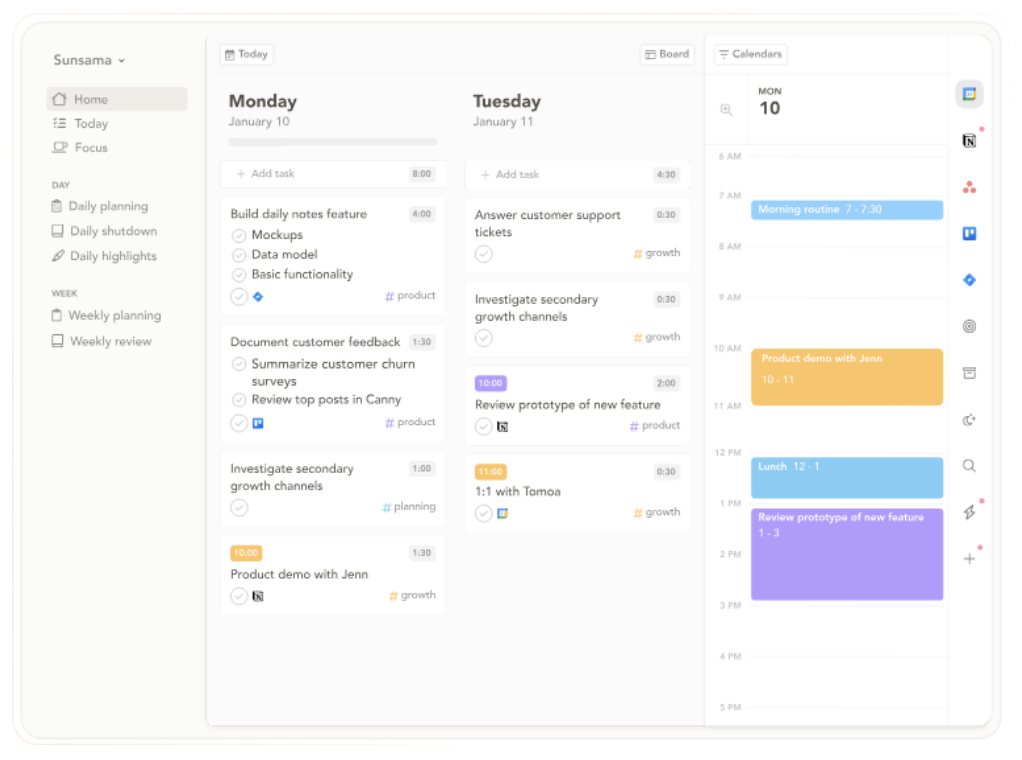 Overview: Sunsama is a purpose-built productivity tool geared towards white-collar professionals. It aims to inject intentionality into task management. The robust 3rd party integration makes it easy to compile all tasks, events, and even emails into Sunsama, allowing users to begin their day by dynamically prioritizing tasks. Throughout the day, the sleek, distraction-free design helps facilitate focus. To wrap up each day, Sunsama prompts users to reflect on their tasks and visualize their progress.