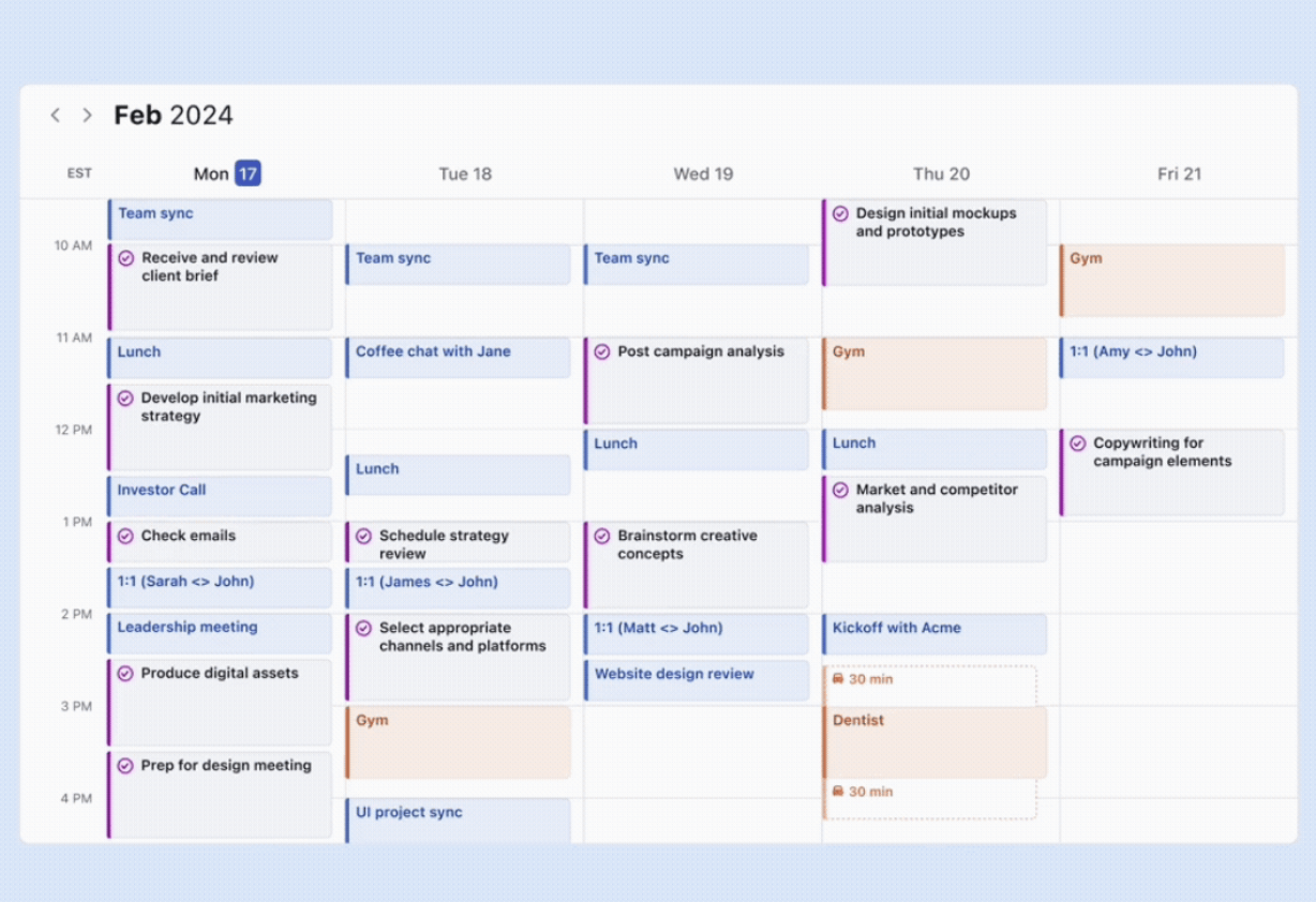 One of Reclaim’s main strengths is its high level of automation. Once configured, the system continuously adjusts the calendar without requiring frequent user input, which helps reduce cognitive load and scheduling friction. Its strong integration ecosystem (Google Calendar, task tools, Slack, Zoom) makes it particularly powerful for teams. Reclaim also excels at defending focus time and preventing meeting overload, which directly addresses burnout and time fragmentation.