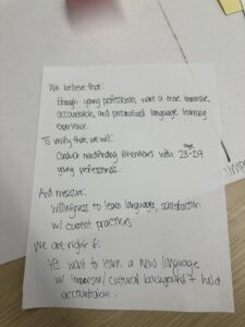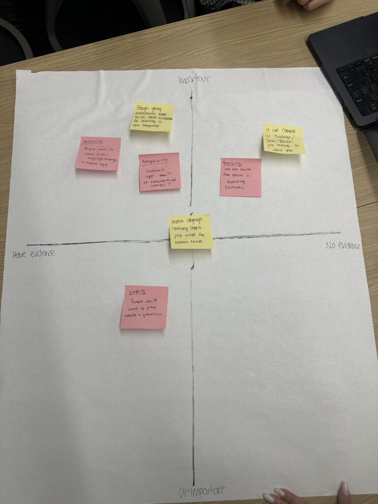 Mapping our assumptions helped us see the most crucial risks. We realized that language learning is in high demand and that there’s plenty of evidence people want to use mobile apps to learn languages. However, these risks we thought of haven’t been researched yet.
