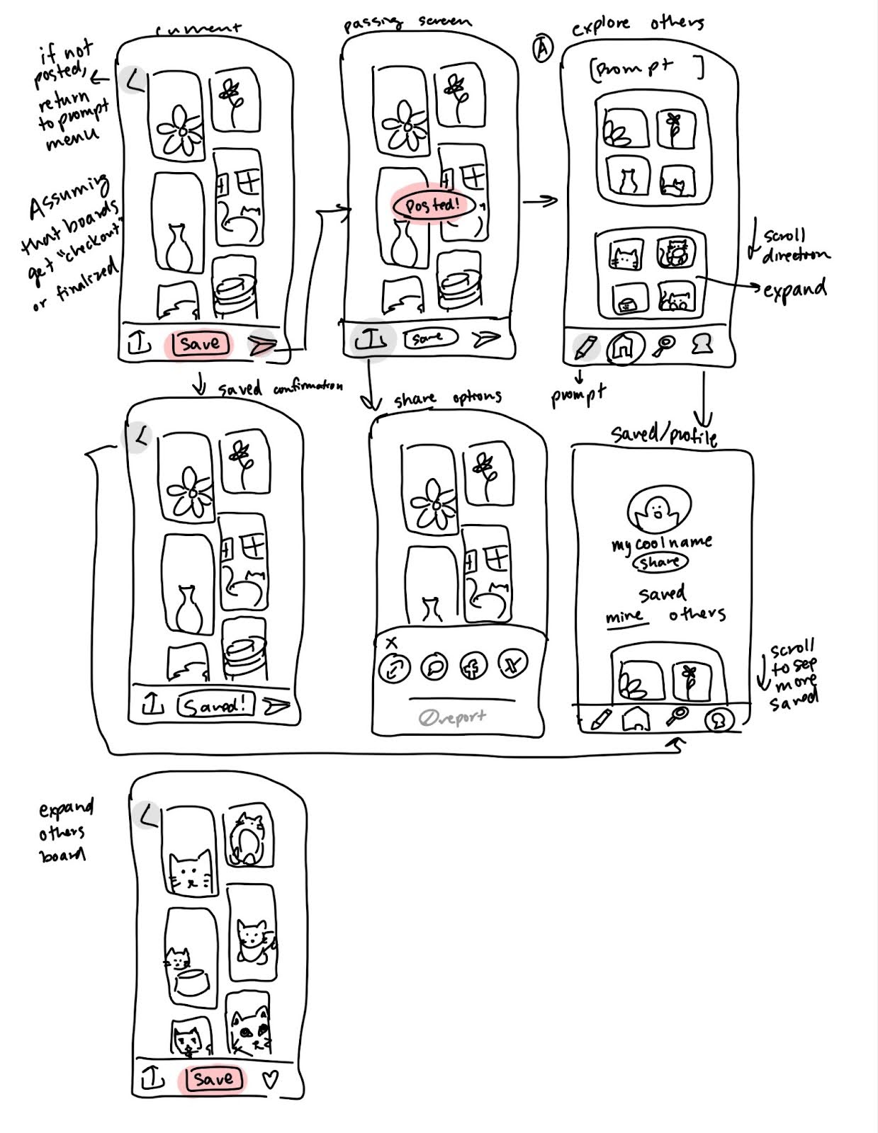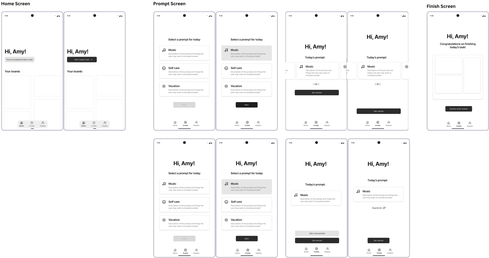- We also decided that we don’t want to limit the user to one prompt per day in case they want to do more, so one of the screens I created is no longer needed (the “create” page when the user completed a board for the day)