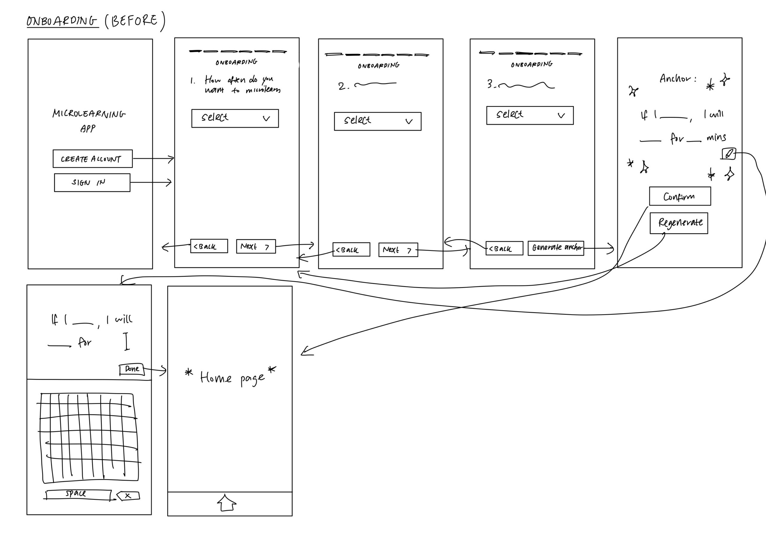 We created wireflows for our two core interactions: anchor onboarding and microlearning session logging.
