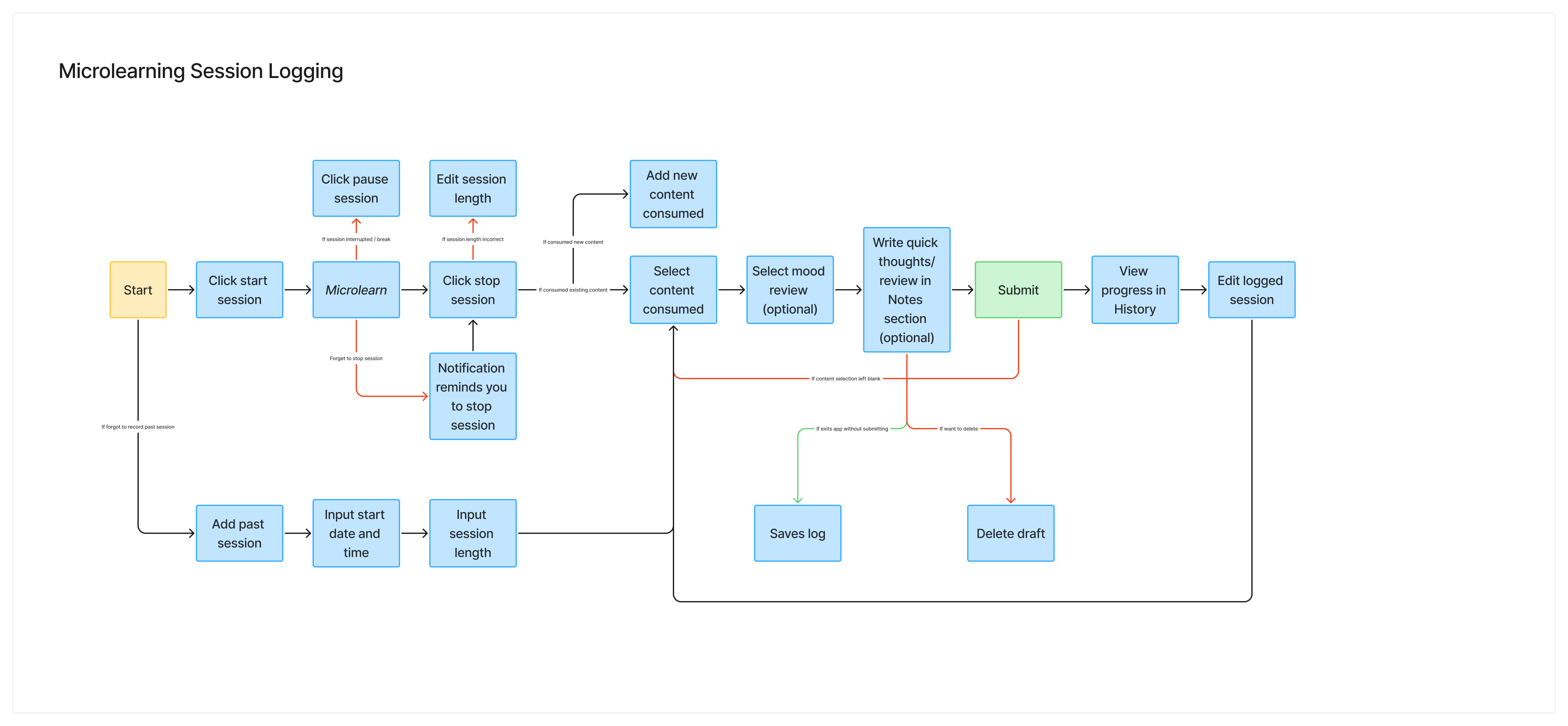 We also created a wireflow for microlearning session logging because the Pure Vibes user is motivated by experiences that feel light, positive, and emotionally rewarding. To support this, we designed a low-friction logging system with a simple mood tap (e.g. selecting a happy to sad face scale) and an optional short notes section for reflections. Viewing a history of past sessions adds a small but delightful layer of reinforcement, helping users see their progress and feel encouraged to continue microlearning.
