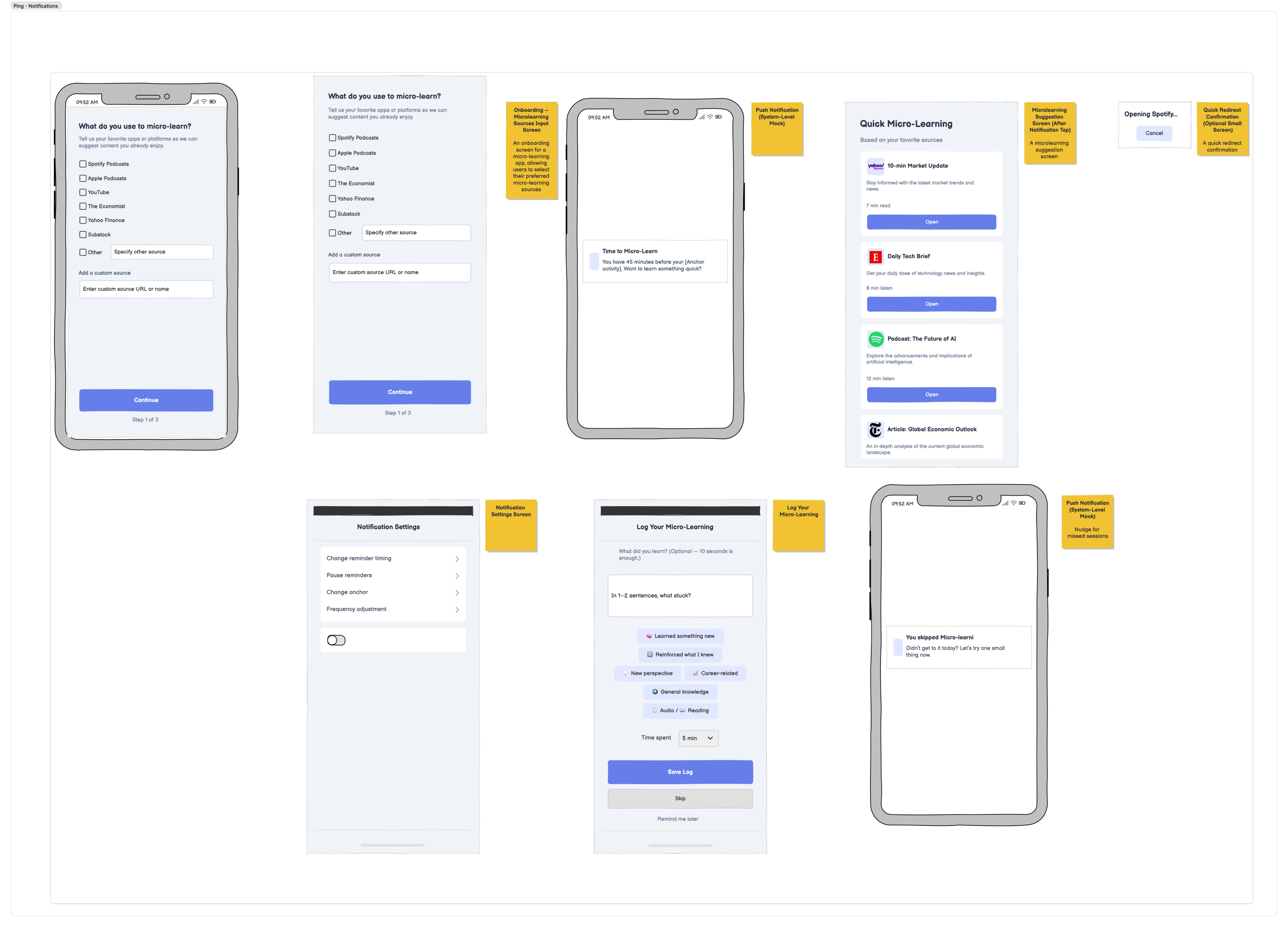 I started off by sketching the bare MVP for the notification task flow. The core functionality was there (onboarding for sources, a push notification, suggested content, and a quick redirect) but the overall experience felt too minimal and didn’t fully communicate the tone we want for the app. The team suggested adding a few supporting features to make the system feel more complete, such as notification settings so users can adjust timing, and an optional “log your micro-learning” screen to reinforce reflection and habit-building. We also discussed edge cases, like what happens if a user misses their anchor reminder, which led us to add a gentle nudge screen for skipped sessions.