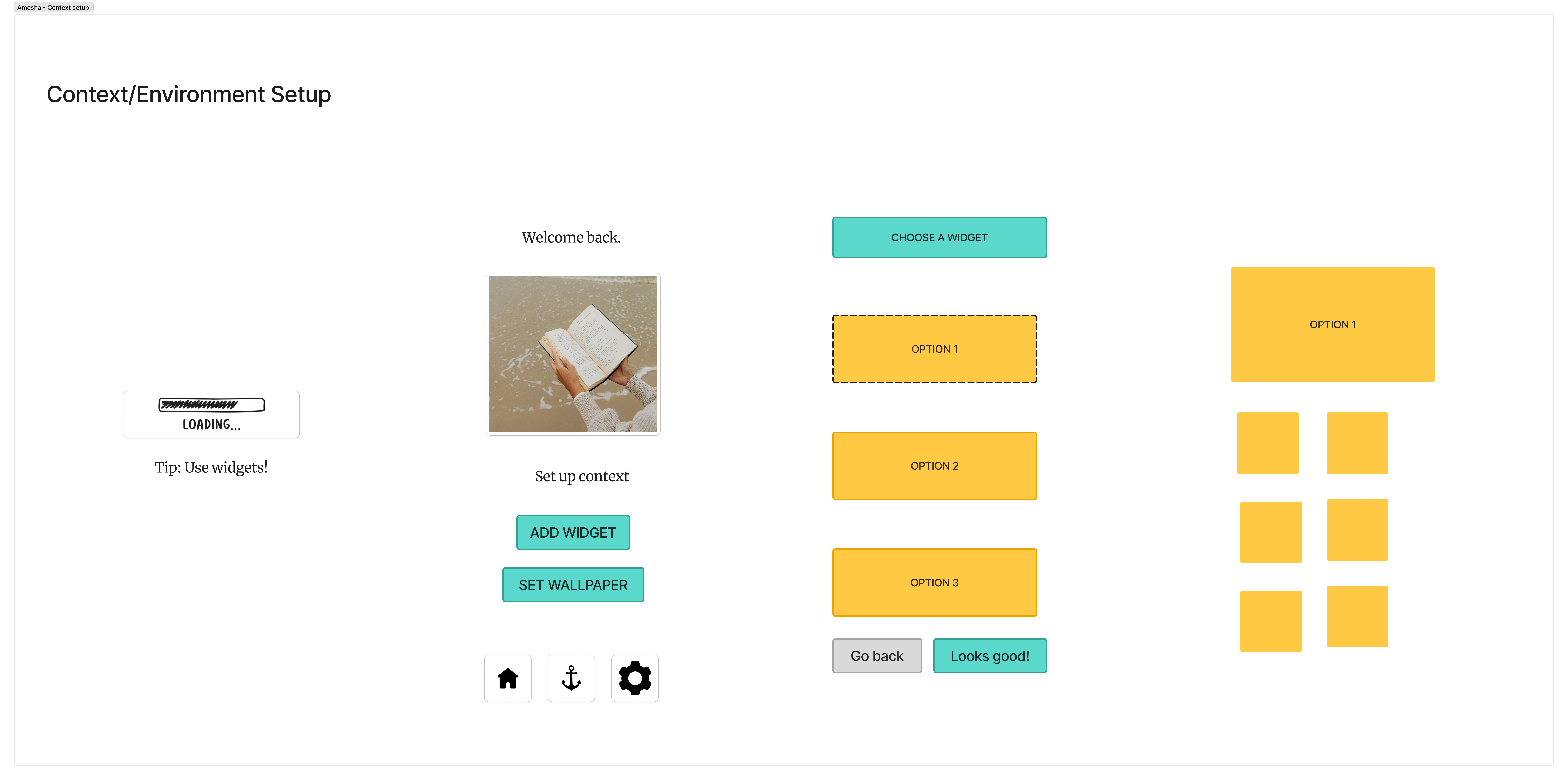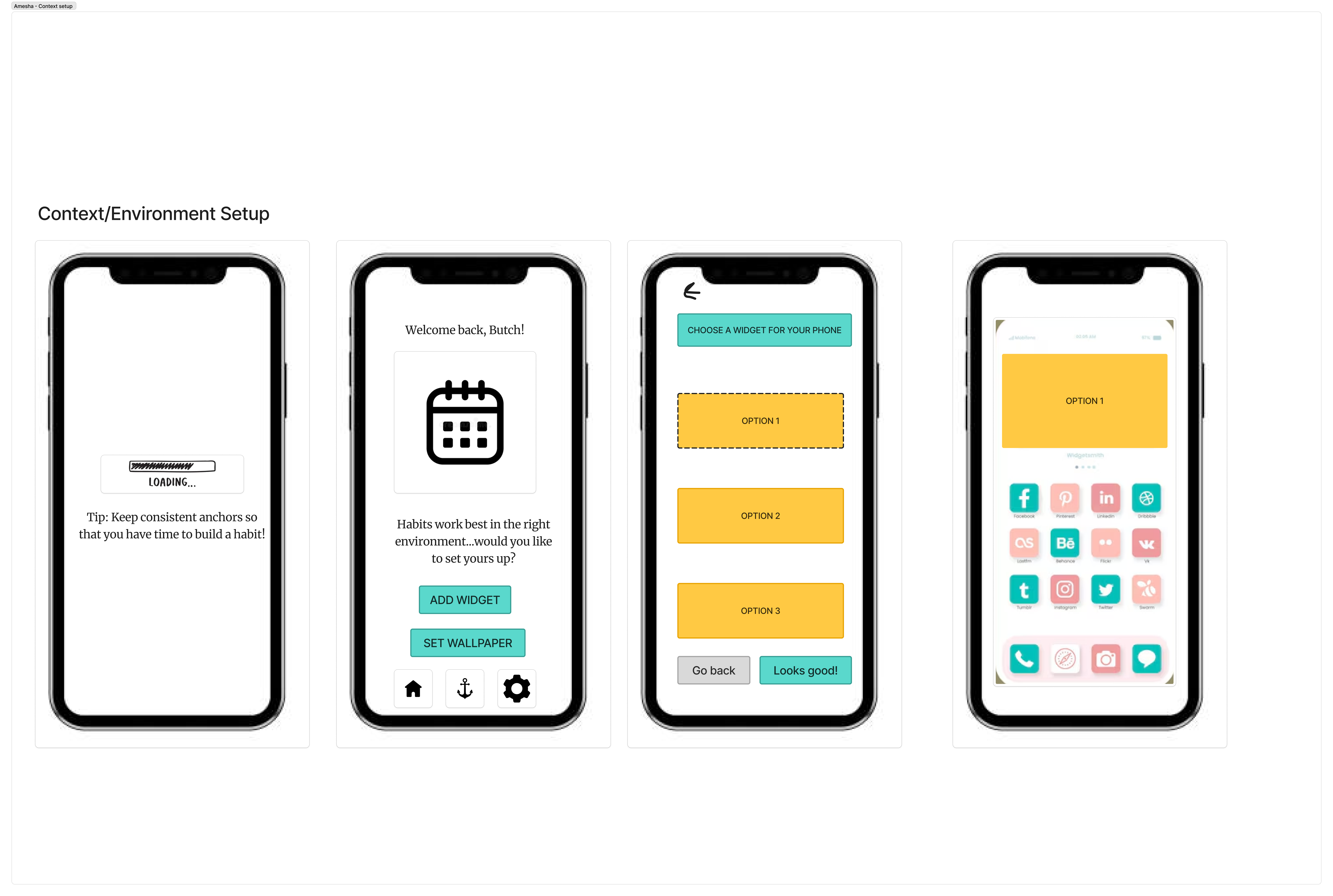 I started by sketching the bare MVP for the context and environment setup flow. The basic pieces were there. A loading screen, a welcome screen, options to add a widget or set wallpaper, and a widget selection screen with confirmation buttons. Functionally, it worked, but when we reviewed it as a team, it felt a little flat and disconnected. The hierarchy was not strong enough and the primary actions did not stand out clearly. The experience also felt a bit generic. The welcome message was neutral, the screens were floating without much context, and the widget display did not clearly show how it would actually live on a user’s home screen.