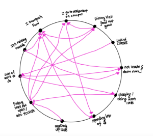 For my connection circle, all of the connections are positive. What I noticed was that the two behaviors I was trying to kick both led to me spending more money than if I went to the dining hall. Additionally, it seems that school and being busy generally led to me sleeping less, waking up later, and having less time to eat, all of which led to me DoorDashing/eating out more.