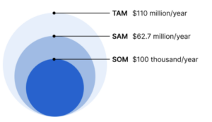 We calculated our Serviceable Addressable Market (SAM) by looking at the adoption rate of an analogous product in our TAM. A rough analog for our concept is the productivity and communication tool Slack. We found that about 57% of US colleges have adopted Slack and assume that our solution would see a similar trend. Based on our pricing model, this market would yield $62.7 million per year in revenue.