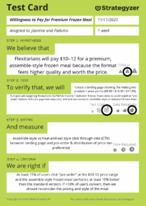 - “Consumers are comfortable with a frozen meal experience that requires “light assembly” instead of heat-and-eat”. This is testable and important, but it is secondary to price acceptance. Even if people like the format, the product still fails if they won’t pay $10–12 for it. So this assumption becomes meaningless unless we first validate willingness to pay.