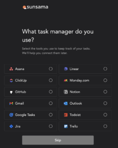 Sunsama, a productivity app that helps the user set goals to complete tasks within a set timeframe, had a lot more friction because it wanted to integrate itself with the scheduling tools I already use. It asked me which task manager I used, giving me a wide array of options (see screenshot). After that, it asked which calendar I used, and when I checked Google Calendar, it requested permissions to view and edit calendar items via Google. This definitely slowed down the onboarding process, but seemed worth the sacrifice to appeal to a market of organized people who feel spread among too many tools, and want something to effectively read from all of them and save them time.