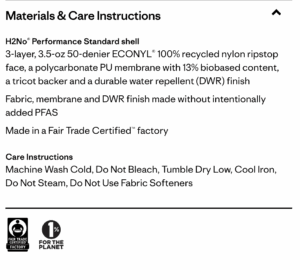 Patagonia consistently emphasizes its morals and priorities of sustainability and nature preservation to their customers, ensuring that their customer base is aligned with the company in terms of their values. Prioritizing value alignment with customers allows Patagonia to optimize for customer lifetime value—the customers that deeply align with Patagonia’s mission will feel more deeply connected to the company and more persuaded to come back and make more purchases. This is evident through many features on the Patagonia website, such as their material and features descriptions of any given product. On each product’s page, Patagonia showcases that the product was “made in a Fair Trade Certified™ factory” or that “Patagonia has pledged 1% of sales to the preservation and restoration of the natural environment”. Screenshot of Materials and Care Instructions below, with both a statement about being “made in a Fair Trade Certified™ factory” and the badge of pledging 1%.