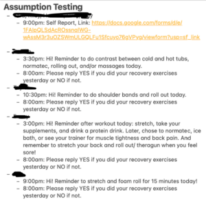 - Comments: On day 1 and day 2, athlete responded with “I actually will go roll out right now” immediately after the reminder was sent.