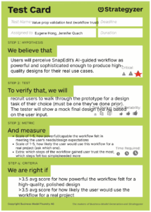 When it comes to how we identify our riskiest assumptions, we had two main frameworks to assess them under. The first is according to our assumption map, with the uncertainty and importance axes, and the second was our initial business problems and needs. Since SnapEdit faces user churn to Canva and low user retention, we put business critical assumptions (ie. clear differentiation from Canva enough to avoid churn, addresses clear use cases as the most appropriate choice from users, provides enough value that the user is confident in both the final output and will keep returning to) as riskiest and priority to address over just product usability.