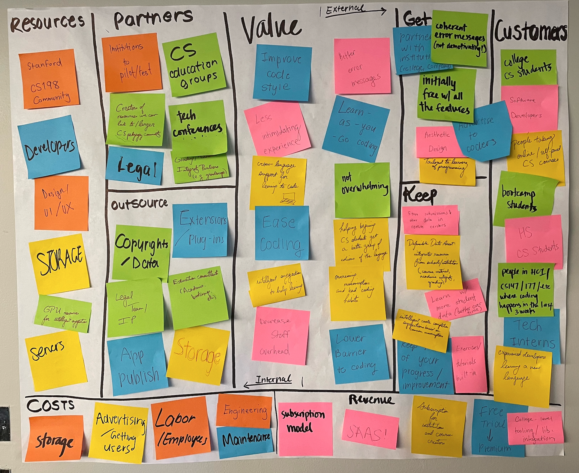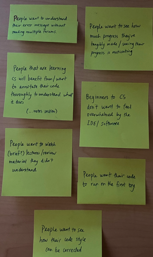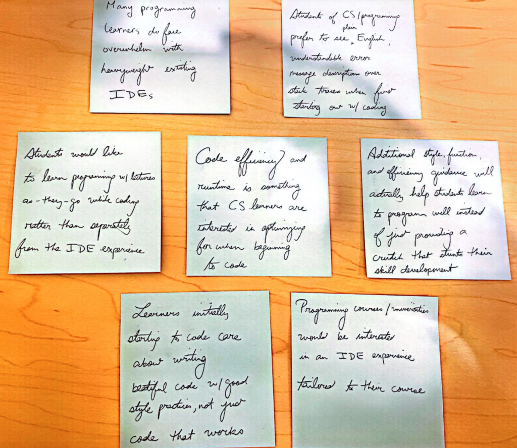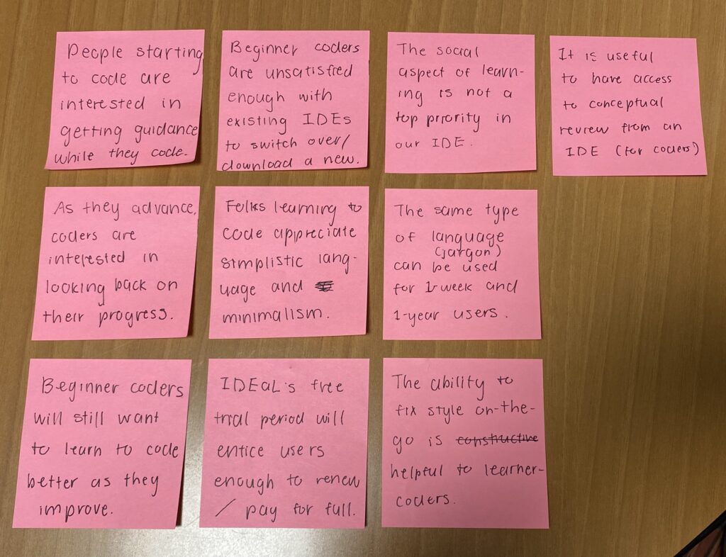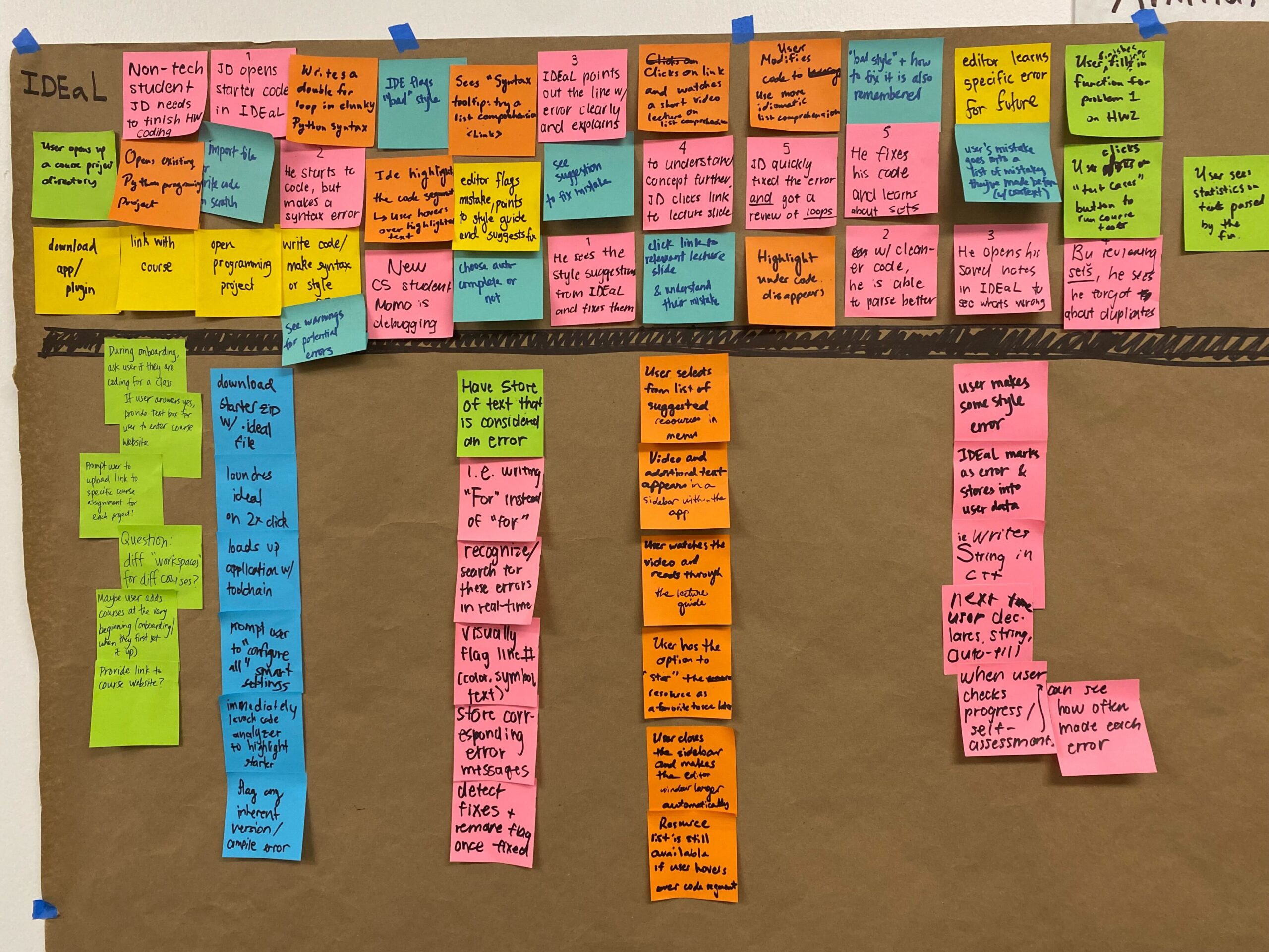 Our storymapping board is set as the featured image above, keeping in mind personas of a student who is first starting up a coding assignment, a student who is deep in the debugging process, and a coder who wants to check up on their progress in their IDE. We fleshed out the steps and the details (along the vertical axis, below our activities) for several major activities that we chose.